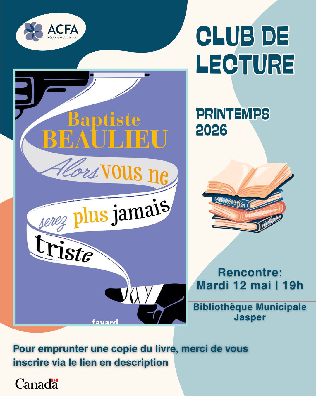 Le club de lecture du printemps arrive et, avec lui, un nouveau livre à explorer ! Rejoignez-nous pour discuter du livre Alors vous ne serez plus jamais triste de Baptiste Beaulieu. Inscrivez-vous pour emprunter ou acheter une copie du livre 📖