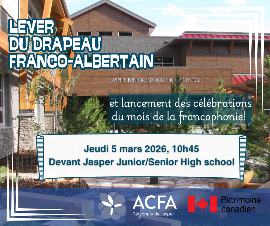 Rejoignez‑nous pour célébrer la francophonie albertaine lors du lever du drapeau franco‑albertain à l’école Jasper Junior/Senior High School, marquant le lancement officiel des activités du Mois de la francophonie ! Cette édition revêt une importance toute particulière : en 2026, l’ACFA célèbre son centenaire, et le gouvernement de l’Alberta a proclamé 2026 Année de la francophonie: une reconnaissance FRABuleuse qui met en lumière 100 ans d’engagement, de fierté et de vitalité francophone dans notre province.